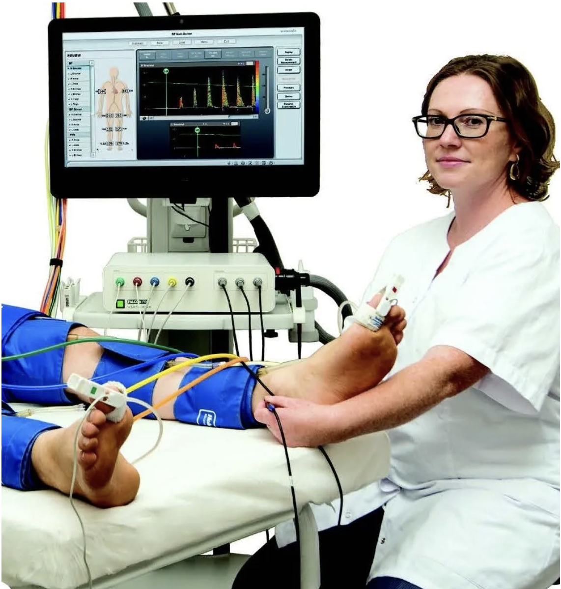 - Depending on the body part being evaluated, multiple blood pressure cuffs are applied to various locations on the arms and legs.